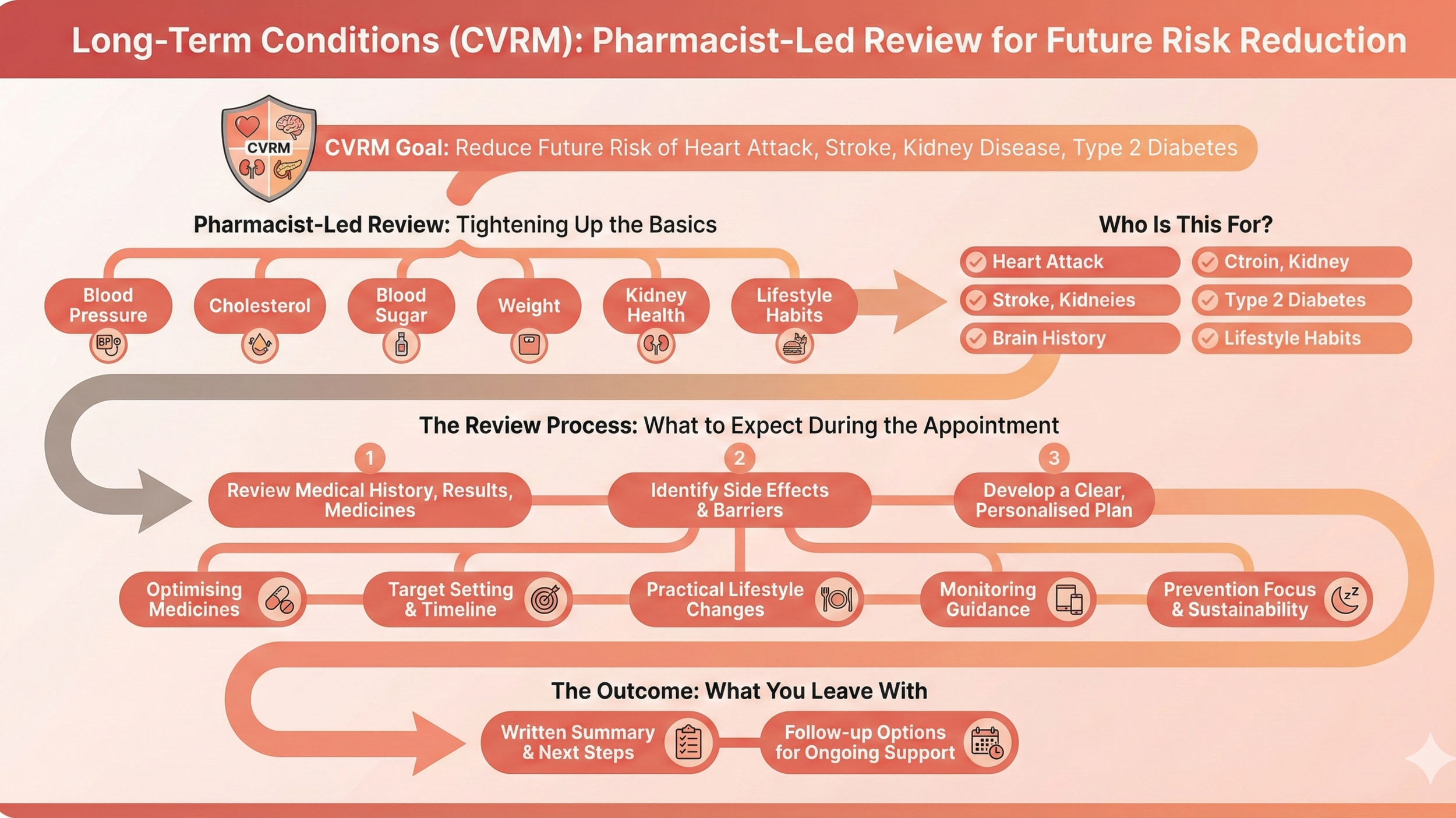 Long-Term Conditions (CVRM) is a pharmacist-led review designed to reduce your future risk of heart attack, stroke, kidney disease and type 2 diabetes — by tightening up the basics that actually move the needle: blood pressure, cholesterol, blood sugar, weight, kidney health, and lifestyle habits that are realistic in the real world.